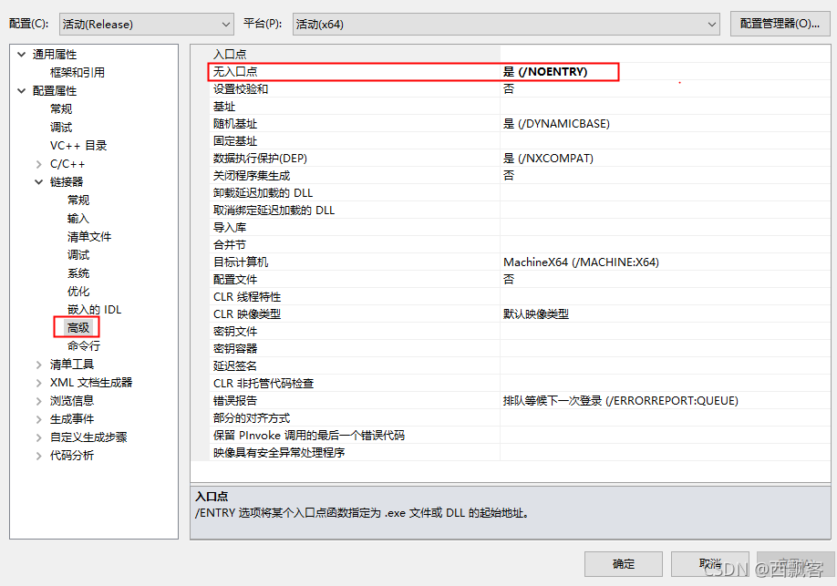 解决办法:右击,项目属性–>连接器–>高级–>无入口点:改成 是。/NOENTRY 选项是创建纯资源DLL所必需的。使用此选项可防止LINK将对_main的引用链接到DLL。