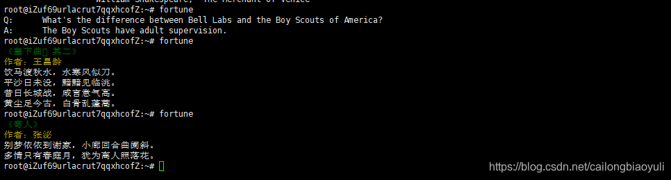 root@iZuf69urlacrut7qqxhcofZ:~# sudo apt-get install fortune fortune-zh