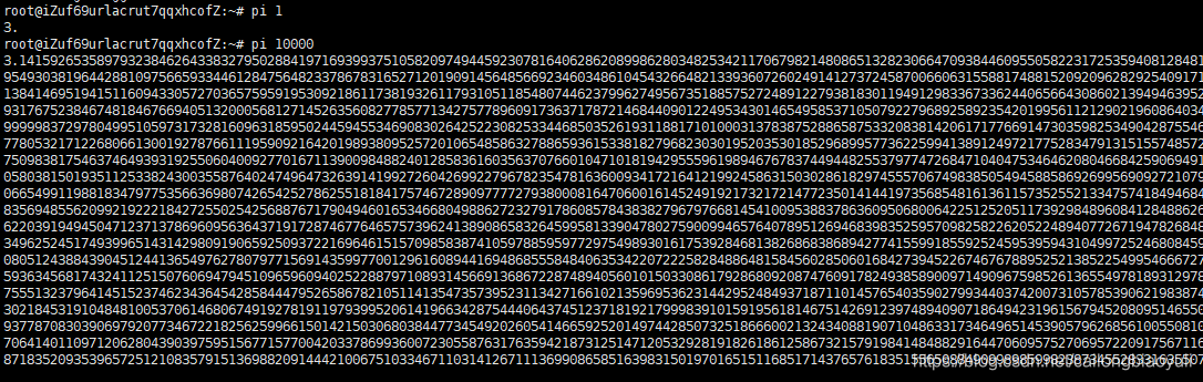 root@iZuf69urlacrut7qqxhcofZ:~# pi 10000 打印一万位~
