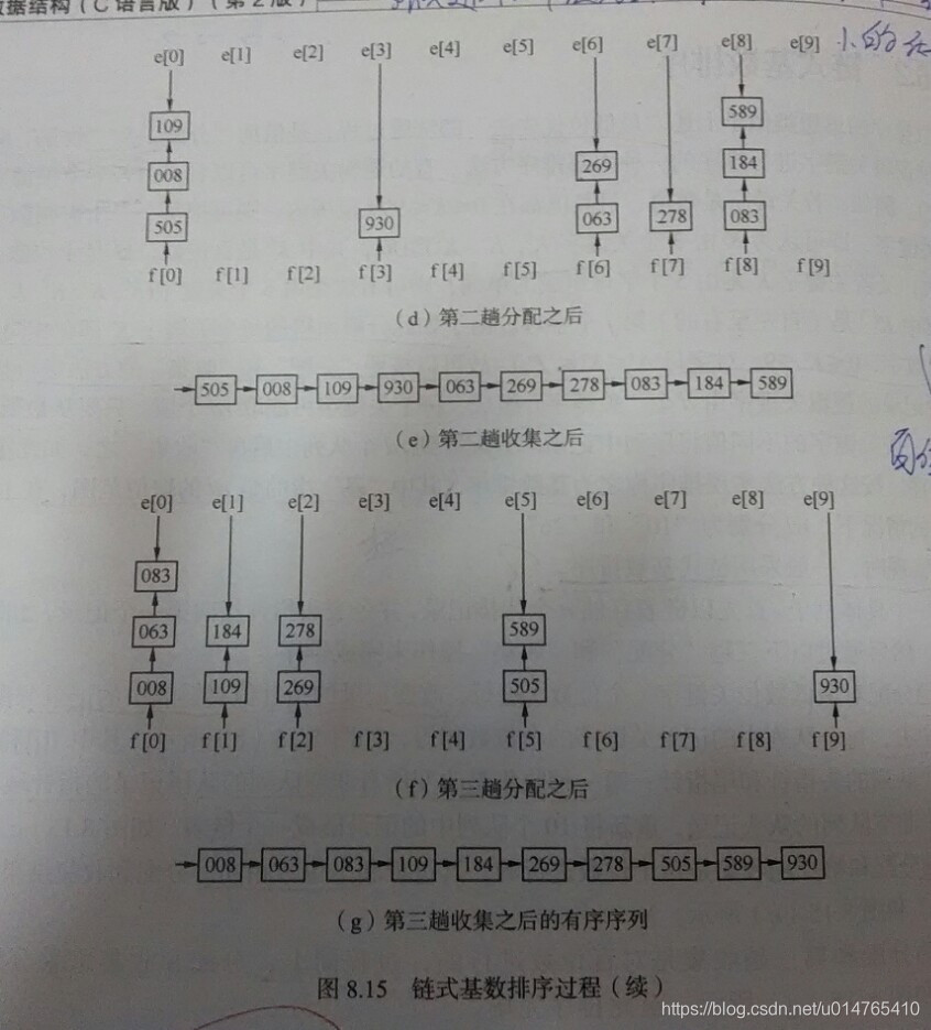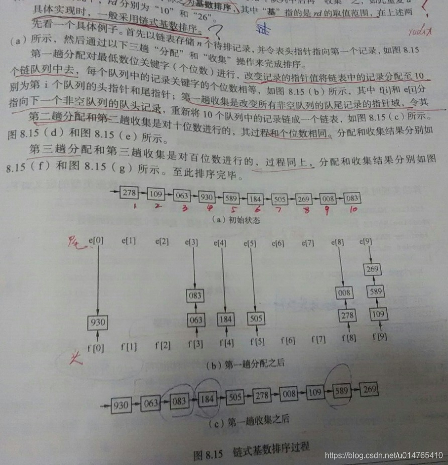2、空间复杂度:所需2rd个辅助队列指针,以及每个数据元素中存储的一个指针,共n个存储空间,所以,空间复杂度为O(n+rd);