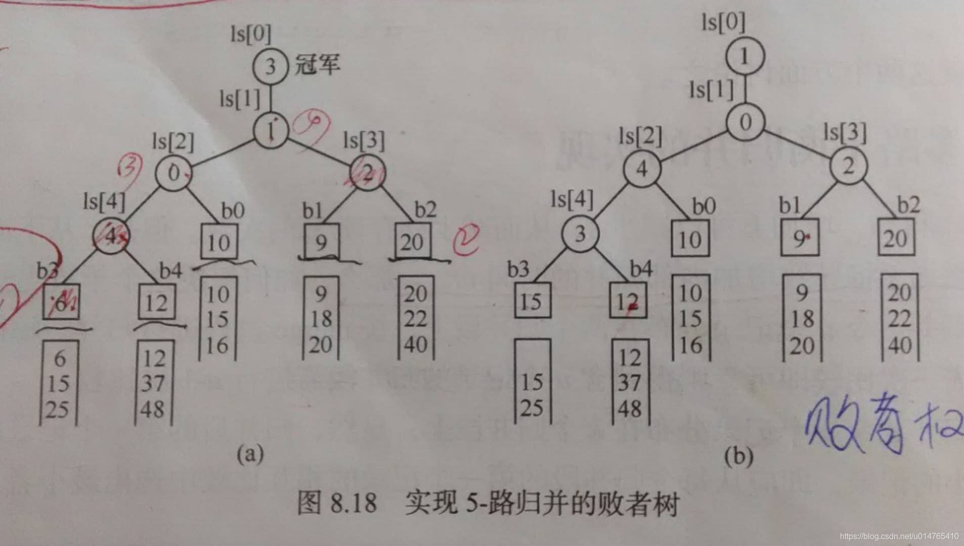 此时,可以看出,归并时间并不会随k的增加而单纯下降,而是呈:先下降后上升的趋势。若想消除k的影响,则必须消除 (k-1)/(log2k) ,则,使 每次选出最小关键字的比较次数从 k-1降到 log2k 即可。未达到这个目的,我们可以用 “败者树”来 选出最小关键字。