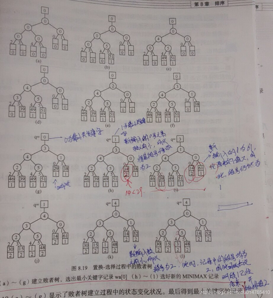置换-选择排序中,WA中最小关键字的选出 依然可以用 败者树 来实现,以下为用败者树 选出 最小关键字的过程。