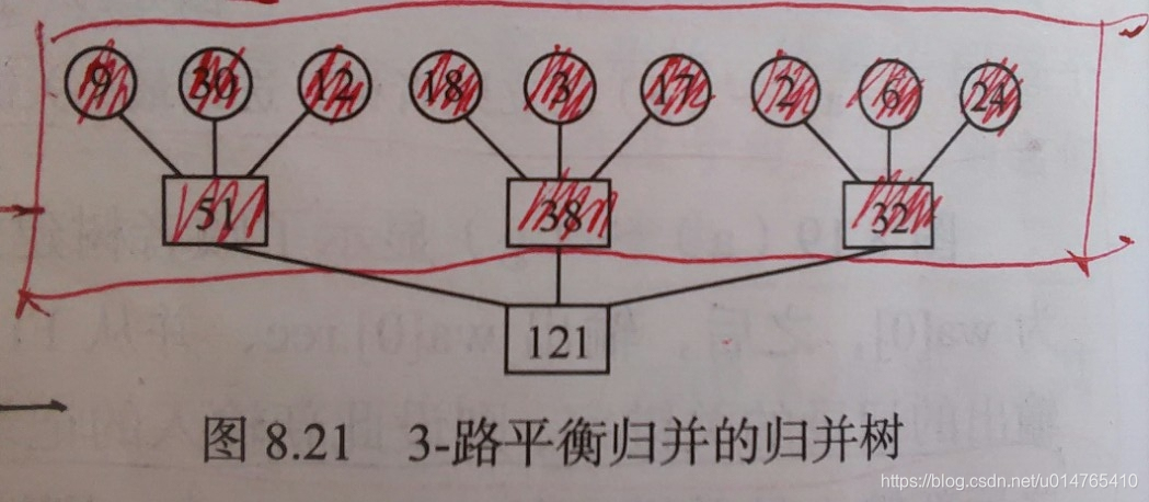 我们先来看一个初始归并段,段长分别为:9,30,12,18,3,17,2,6,24,如果要对这些归并段进行 3-路归并,则可以用如下方式:
