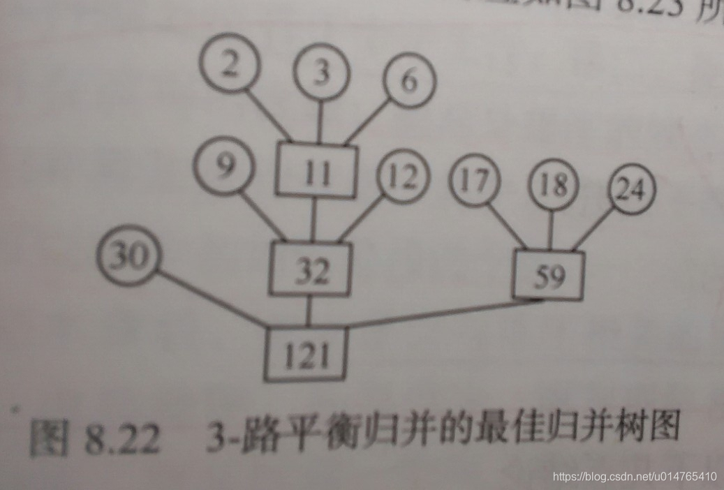 当叶子节点个数 数目 不够时,需附加长度为零的“虚段”,按照哈夫曼树构成的原则,权为零的叶子应离根最远。因此,这个只有8个初始归并段的归并树应如下图所示: