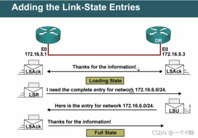 Loading(加载)状态:查看对端的DBD包与本段LSA信息对比,基于未知的LSA新消息发送LSR包进行请求,对端使用LSU进行回复,需要ACK确认