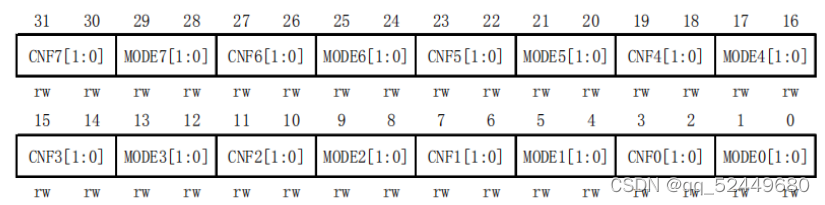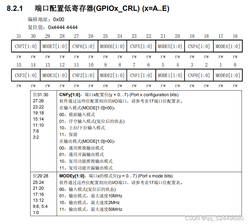 看懂这张图,每4位就是对GPIOx的某引脚操作,这张图是GPIOx->CRL,是引脚0到引脚7的。