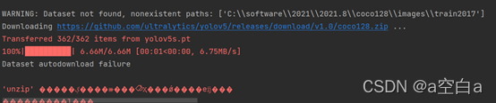 解决二:意思是找不到”yolov5s.pt”,连接不到网址进行下载,需要手动将模型下载下来,然后放入yolo v5文件夹中,会自动调用。