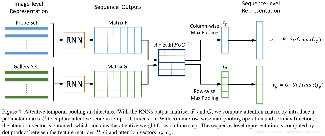 虽然RNN的隐藏状态已经能够利用到时域信息,但是包含很多冗余和背景噪声,所以作者提出了如下时域注意力机制。probe和gallery经过RNN后得到了TxN大小的P、G矩阵,作者学习一个NxN大小的矩阵U: