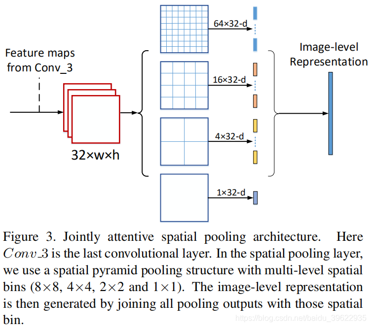 作者使用的是空间金字塔池化层(spatial pyramid pooling(SPP) layer ,《Spatial pyramid pooling in deep convolutional networks for visual recognition》这篇文章提出),就是将原来的cxwxh的特征图,通过4个不同尺度的池化核max pool成cx8x8,cx4x4,cx2x2,cx1x1的大小。然后将其展开成cx64,cx16,cx4,cx1大小的一维向量,再连接到一起,得到cxL的图片向量r。
