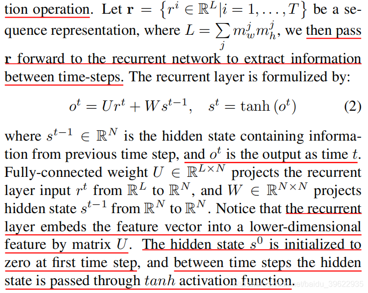 其中U是NxL大小的矩阵,rt是Lx1大小的矩阵,W是NxN的权重矩阵,s的初始状态s0初始化为Nx1的全0向量。o1-ot经过tanh(.)激活函数后作为RNN的输出。这里的RNN利用了时域信息的同时,还将L维的输入降维到N维。