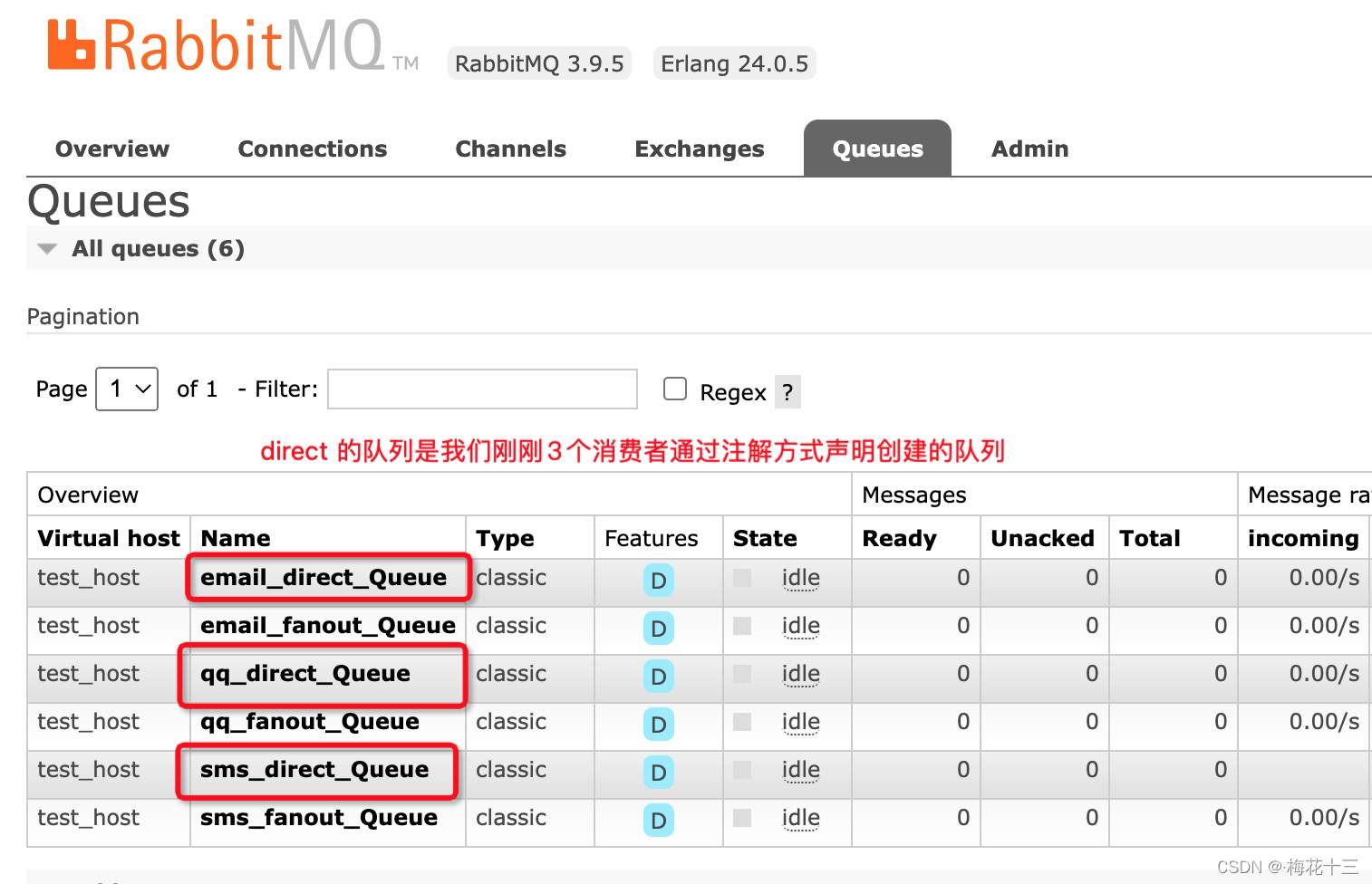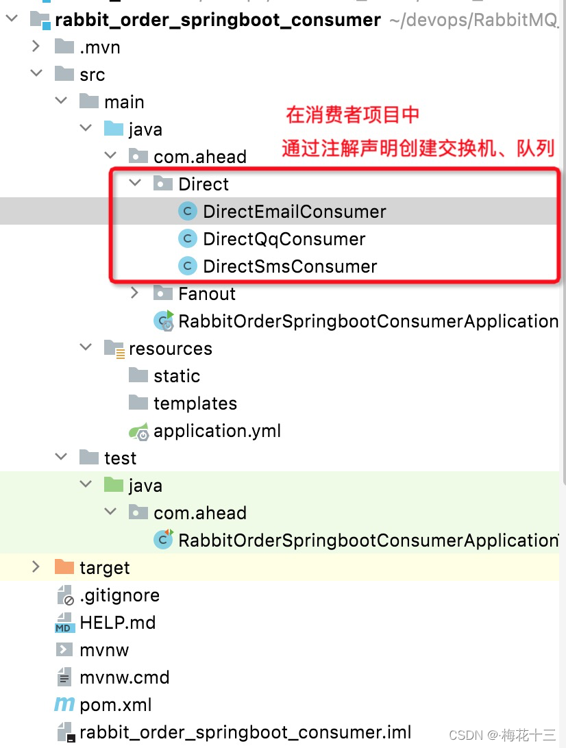 本文讲述的例子是通过注解方式声明队列和交换机,也可以同fanout模式中讲解的例子一样,在生产者项目中,通过编写@Configuration 类进行声明和创建