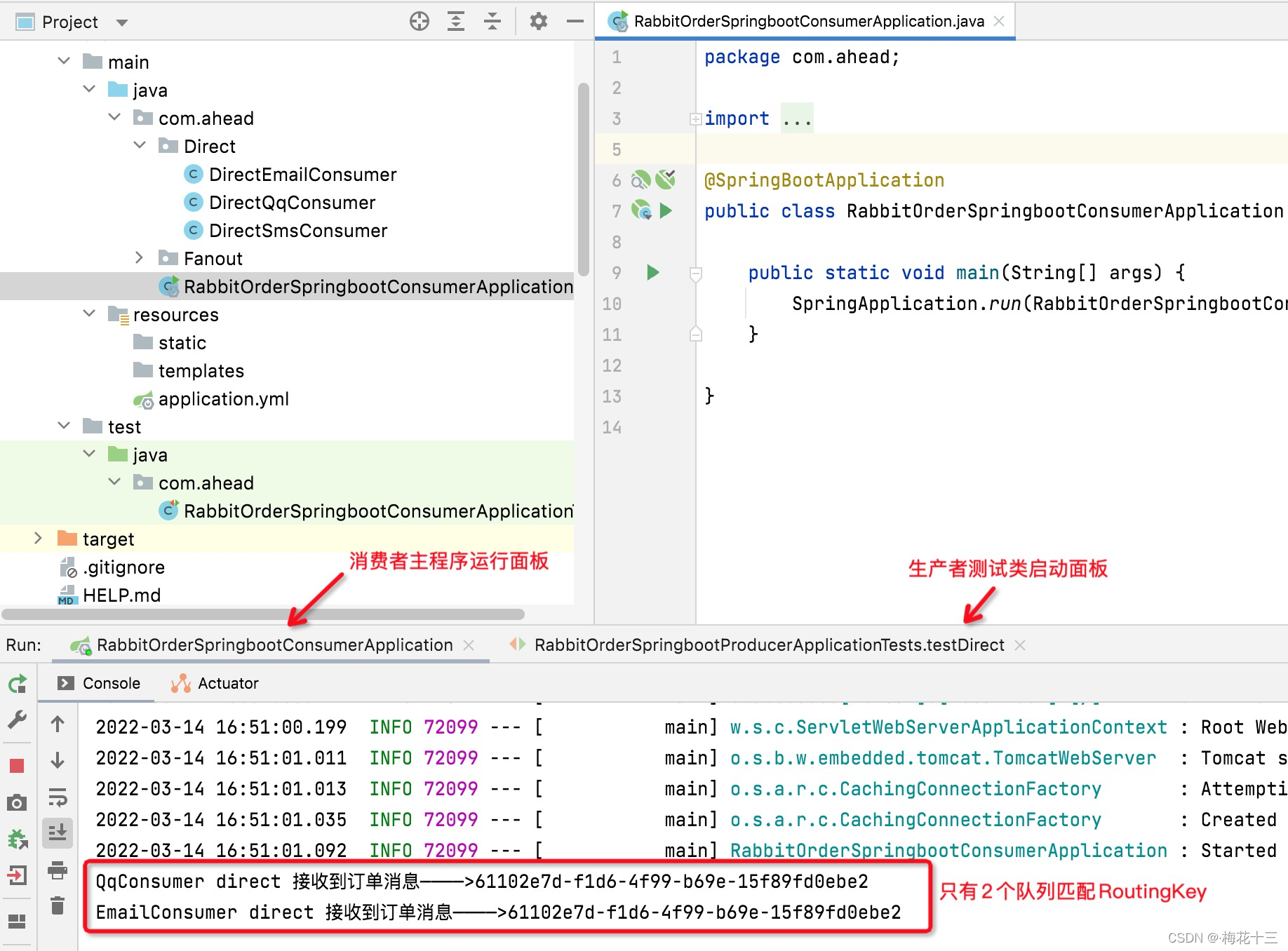 项目结构与《SpringBoot整合RabbitMQ ——Fanout模式》博文中代码一致,不二次贴出。