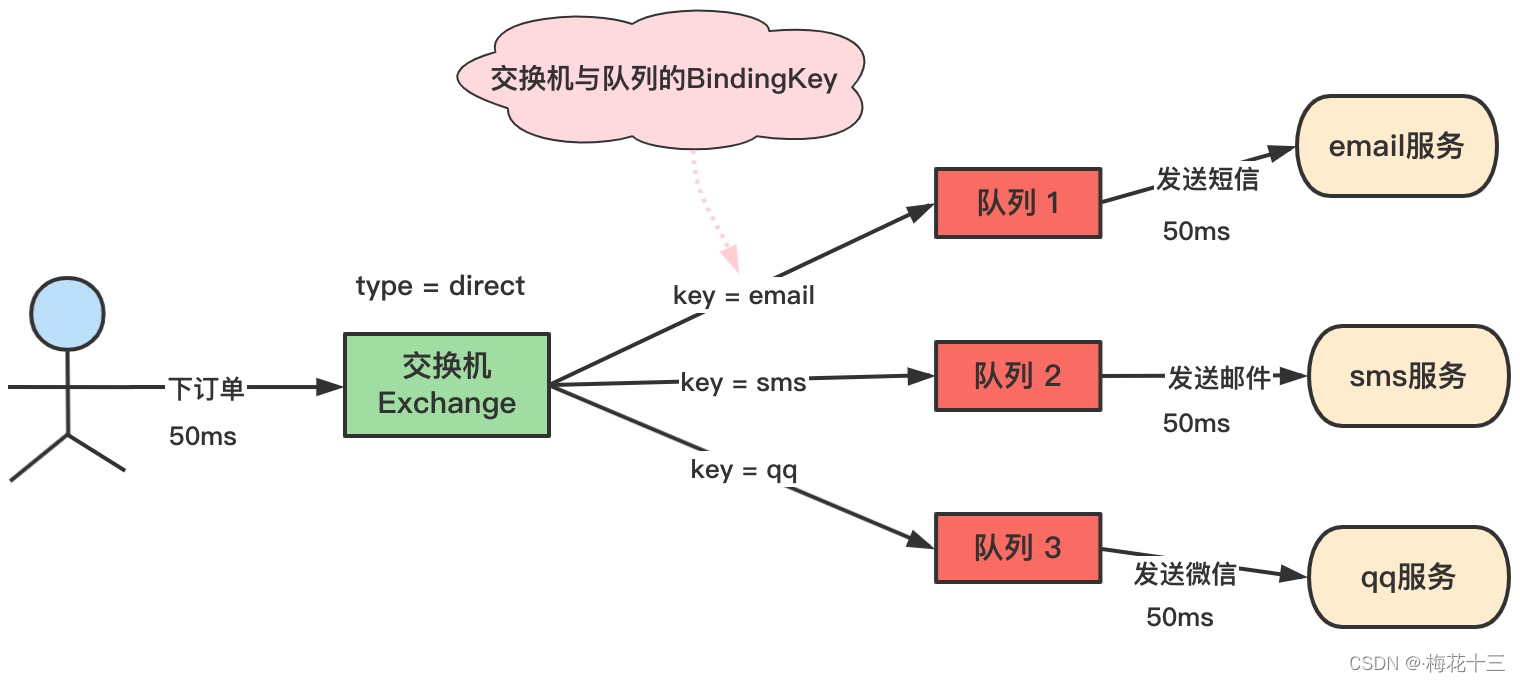 * 交换机direct_order_exchange与绑定的队列的BindingKey匹配的队列才会接收到