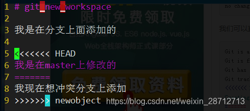 这种情况下,git无法执行“快速合并”,只能试图把各自修改的合并起来,但这种合并可能发生冲突: