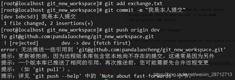 你小伙伴已经向origin dev分支上提交了,你也要对同样的文件修改,并试图推送: