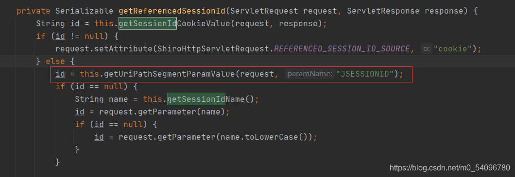 shiro的session管理核心在于org.apache.shiro.web.session.mgt.DefaultWebSessionManager这个类,其中的getSessionId()方法是shiro获取sessionId的方法,shiro通过获取到的sessionId来获取内置的seesion,而当客户端禁用cookie的时候,shiro是无法通过改方法获取到sessionId的,原因如下: