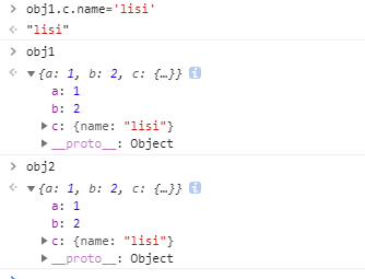 修改obj1中c的对象的名字之后会发现obj1和obj2的值都发生了变化,这就说明了,Array指向的是同一个对象,只是把对象的地址重新拷贝了一下.