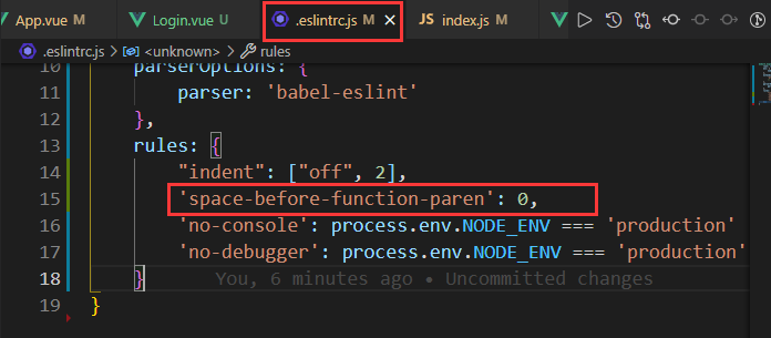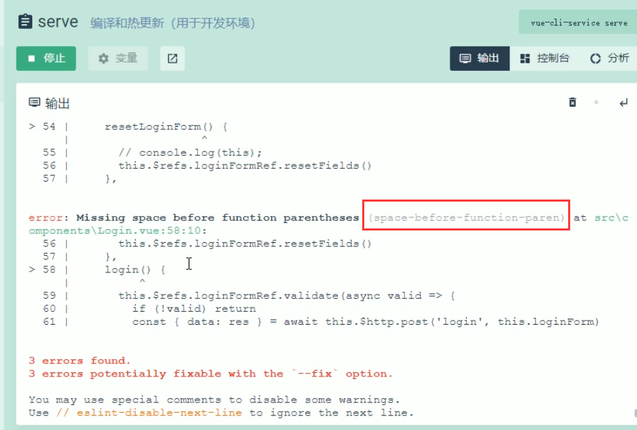 第三个:vue项目中报错说小括号之后要有一个空格:missing space before function parentheses(space-before-function-paren) at