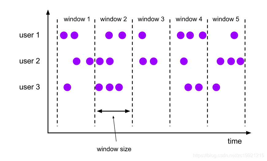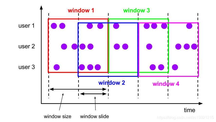和固定窗口类似,它的特点固定窗口(Window Size)基础之上增加了窗口的滑动时间(Slide Size),且允许窗口数据发生重叠,因此一条记录可以属于多个窗口。