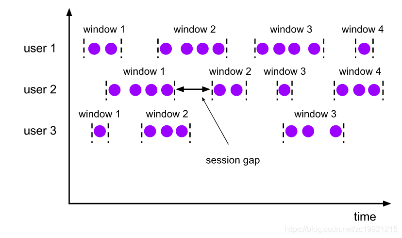 Session Window的目的主要是将某段时间内活跃度高的数据聚合形成一个窗口进行计算。窗口的触发条件是SessionGap,意思是如果在SessionGap时间内没有活跃的数据到来,那么就会触发窗口的计算。和固定窗口一样,Session Window窗口与窗口之间