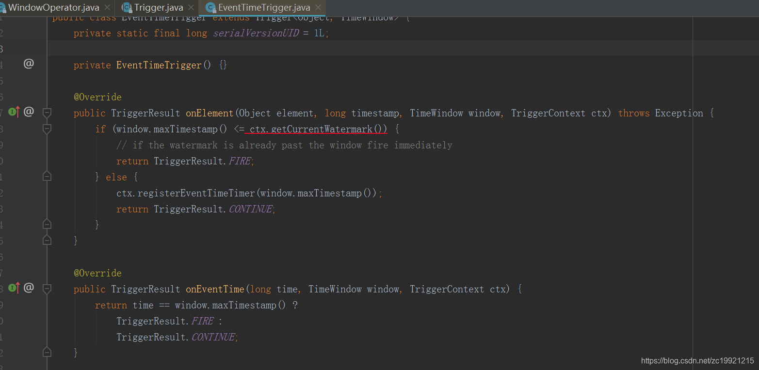 Trigger会判断当前的WaterMark是否超过了Window的EndTime,如果超过了则触发当前Window的计算。如果当前Window未到触发计算的时间的话,那么就会执行ctx.regiserEventTimeTimer(window.maxTimestamp())方法,将Window的触发时间注册成一个定时器,当水印时间达到窗口触发时间的时候,将窗口触发: