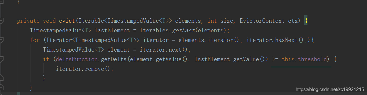 DeltaEvictor: 定义了一个DelataFunction以及一个threshold,比较window中元素和最新元素之间的delta大小,超过了则删除window中的元素