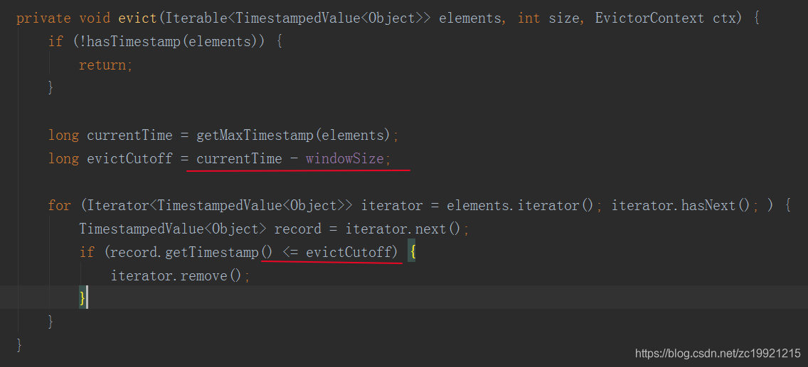 TimeEvictor: 指定一个时间,将window中最大元素的时间减去这个size,然后将低于这个减掉后的时间的旧元素全部剔除掉