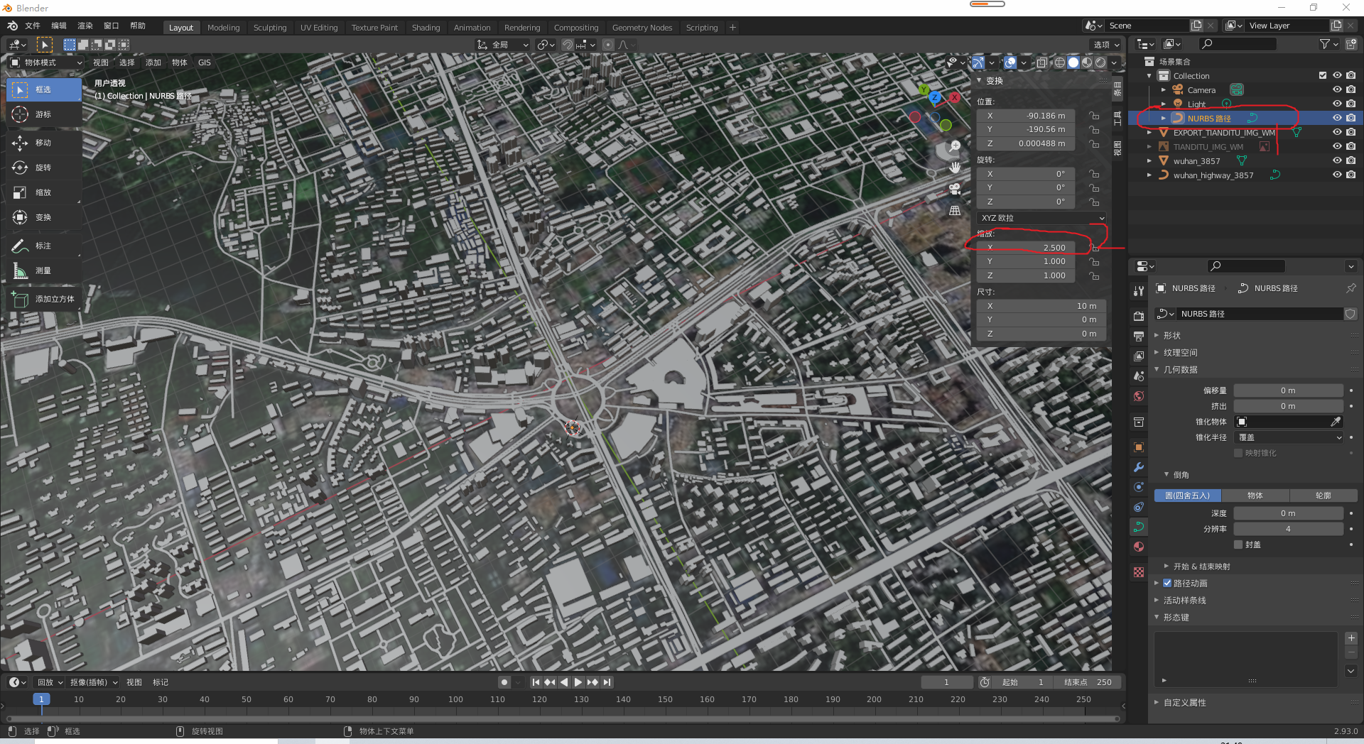 3,设置刚添加的路径曲线 目录-缩放 X设置 2.5,此时视口中道路就有宽度了。