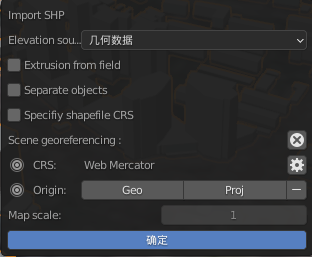 1,打开Blender软件,在BlenderGIS中导入在步骤A中获取的数据(OSM格式或shp格式)。 导入的时候选中默认方式导入可以,