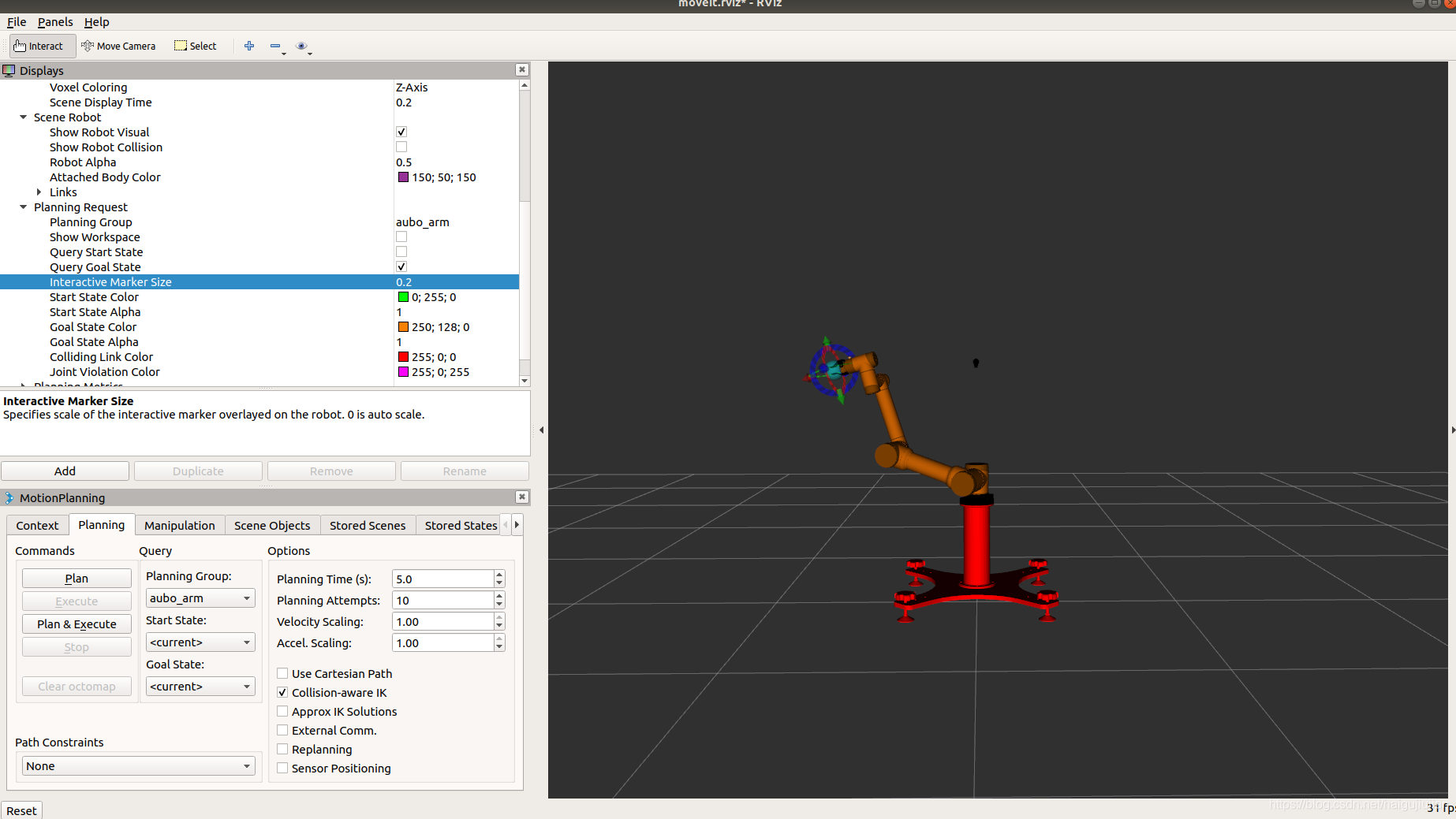 轨迹球消失不见了,无法拖拽机械臂末端,有可能是这个interactive marker size被设置为0了,把它设置成0.2就可以