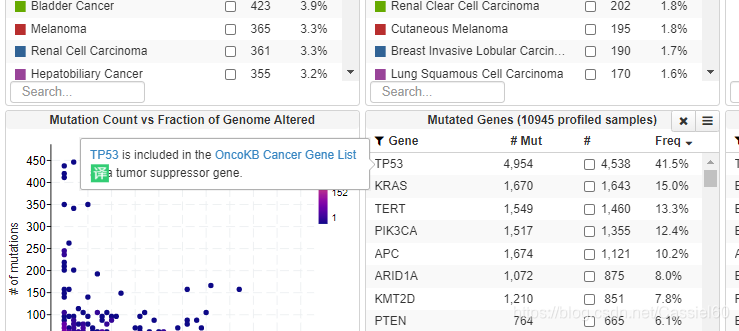这个数据库去根据肿瘤类型查找频率很高的基因,然后把鼠标放在某个基因上,就会看到图一提示: