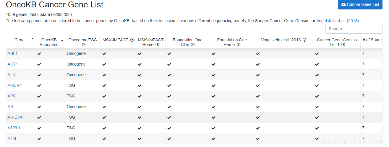 对于每个基因都进行了分类(癌基因还是肿瘤抑制基因(TSG)),权威数据库是否收录。不需要注册,基因列表可以下载的,搜索某个基因进入后,就会看到每个基因上位点的变异,证据级别以及药物情况。