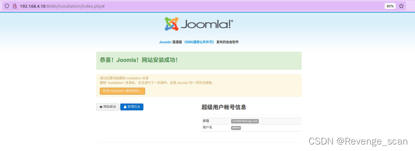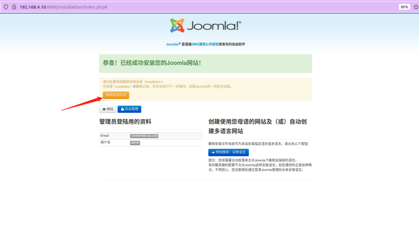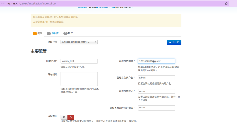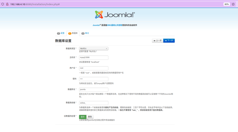 启动后访问`http://your-ip:8080/`即可看到Joomla的安装界面,当前环境的数据库信息为: