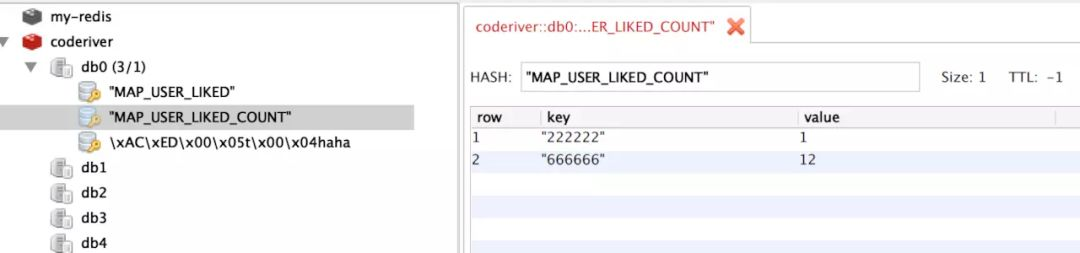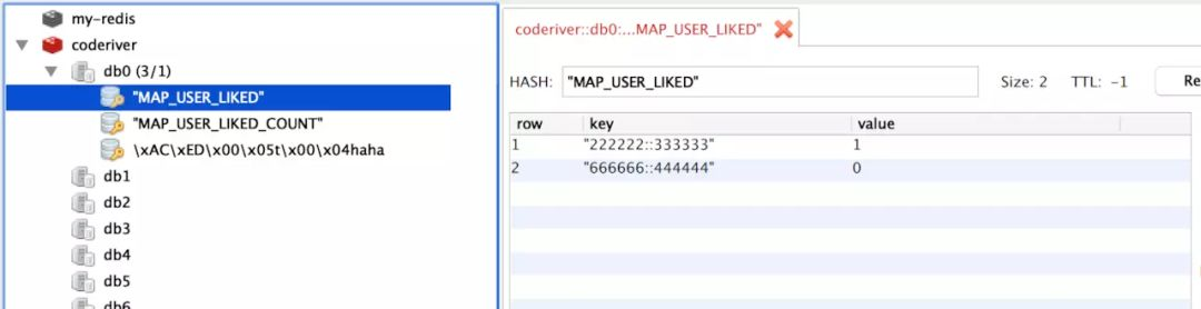 由于需要记录点赞人和被点赞人,还有点赞状态(点赞、取消点赞),还要固定时间间隔取出 Redis 中所有点赞数据,分析了下 Redis 数据格式中 Hash 最合适。