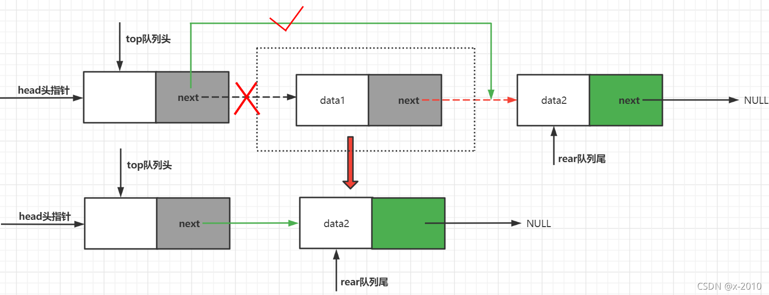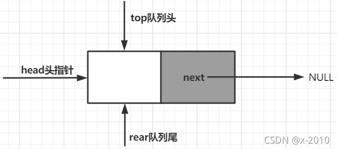 此时队列中未存储数据,top与rear指针同时指向头节点。