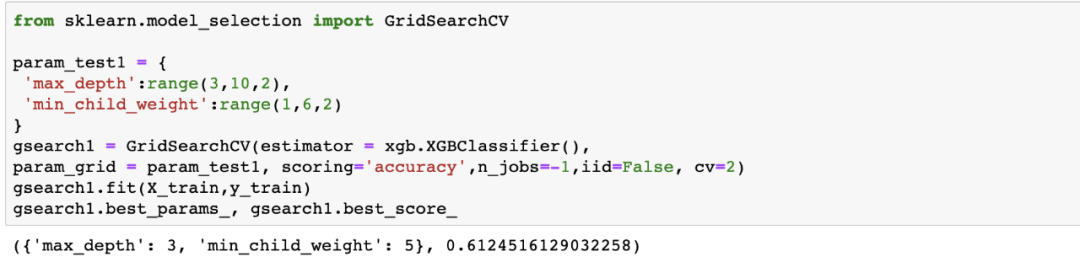 XGBClassifier有很多参数。你可以在这里找到这些参数的列表。对于本例,我们选择max_depth和min_child_weight.