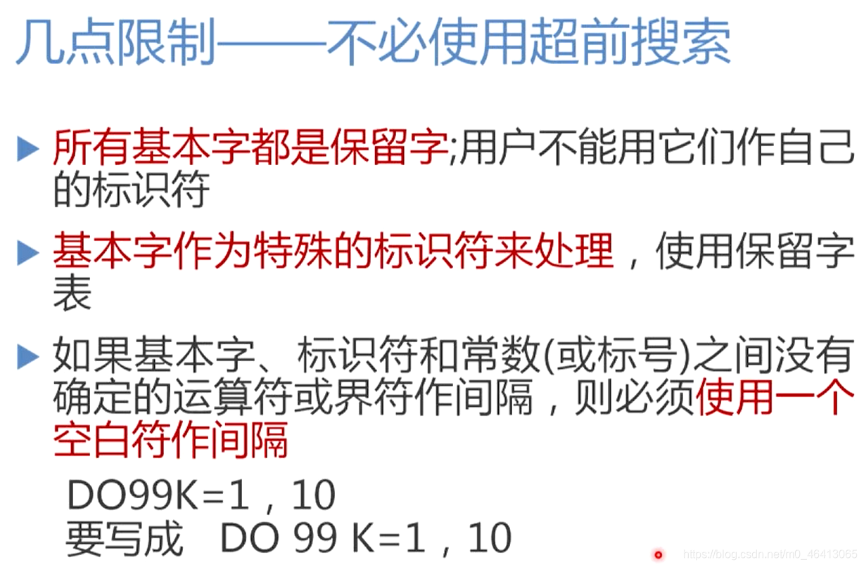 ”。语句24的主要区别在于右括号后的第一个字符:一个为字母,另一个为等号。这就是说,为了识别12中的关键字,我们必须超前扫描许多个字符,超前到能够肯定词性的地方为止。对于1.3来说,尽管都以’D’和‘O’两字母开头,但不能一见‘DO’就认定是DO语句。我们必须超前扫描,跳过所有的字母和数字,看看是否有等号。如果有,再向前搜索。若下一个界符是逗号,则可以肯定D应为关键字。否则,DO不构成关键字,它只是用户标识符的头两个字母。所以,为了区别1和3,我们必须超前扫描到等号后的第一个界符处。对于语句2、4来说,必须超前扫描到与F后的左括号相对应的那个右括号之后的第一个字符为止。若此字符是字母,则得逻辑正。若此字符是数字,则得算术正。否则,就应认为是用户自定义标识符F。