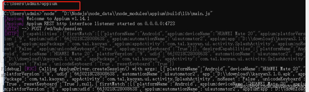 #uft-8 from appium import webdriver from selenium.common.exceptions import NoSuchElementException desired_caps={} desired_caps['platformName'] = 'Android' # desired_caps['deviceName'] = '127.0.0.1:62026' # desired_caps['platforVersion'] = '5.1.1' desired_caps['deviceName'] = 'HUAWEI Mate 20' desired_caps['platforVersion'] = '9' desired_caps['udid'] = '66J0218C28008638' desired_caps['automationName']='uiautomator2' desired_caps['app'] = r'D:\download\kaoyan3.1.0.apk' desired_caps['appPackage'] = 'com.tal.kaoyan' desired_caps['appActivity'] = 'com.tal.kaoyan.ui.activity.SplashActivity' desired_caps['noReset'] = 'False' #设置之后会有Appium的输入法守护来执行输入操作 desired_caps['unicodeKeyboard']="True" desired_caps['resetKeyboard']="True" driver = webdriver.Remote('http://localhost:4723/wd/hub',desired_caps) driver.implicitly_wait(10) def check_cancelBtoon(): print("检查取消按钮") try: cancelBtoon = driver.find_element_by_id('android:id/button2') except NoSuchElementException: print("没有取消按钮") else: cancelBtoon.click() def check_skipBtoon(): print("检查跳过按钮") try: skipBtoon = driver.find_element_by_id('com.tal.kaoyan:id/tv_skip') except NoSuchElementException: print("没有跳过按钮") else: skipBtoon.click() #调用上面的两个方法 driver.implicitly_wait(5) check_cancelBtoon() driver.implicitly_wait(5) check_skipBtoon() driver.implicitly_wait(5) check_cancelBtoon() check_skipBtoon()注意:appium在cmd里启动,要不然脚本可能会运行不通过如下截图