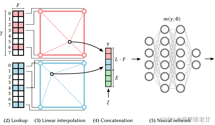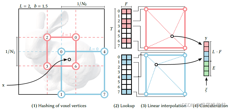 由简介可知,Instant-ngp项目最大的亮点在于提出了一个基于哈希搜索的编码方法,仅需一个小规模神经网络就能够实现全连接网络的效果,而且不损失精度。因此,该文章的核心要点可被分为两个部分:1). 多分辨率哈希编码的设计与实现;2). 基于编码的神经网络训练。