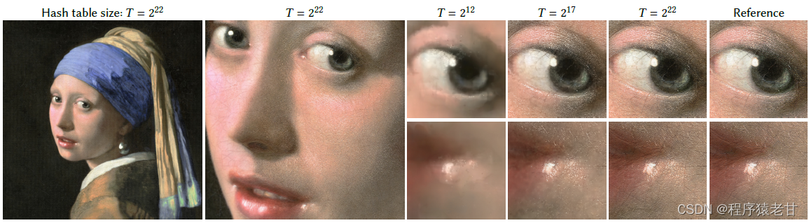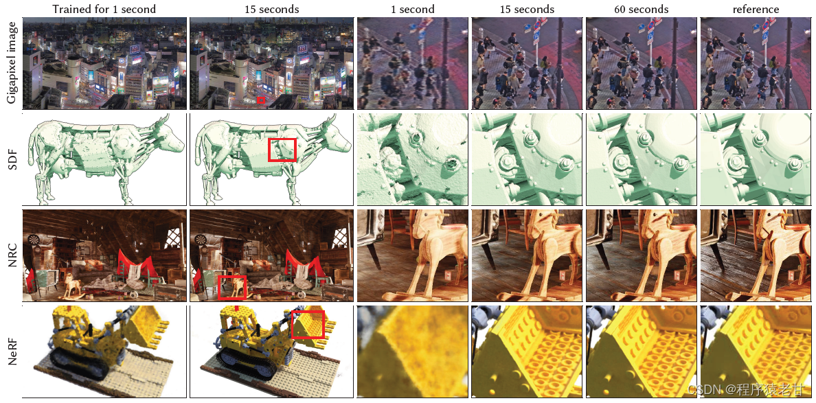 优点包括可训练,特定于任务的数据结构,解决了大量的学习任务,使得小样本MLP可用。但是,这个过程启发式的,结构化的调整,进而造成因调整产生的性能下降,泛化性差,并行设计开销大。Instant-ngp的建立则是为了解决上述问题。基于由粗到细的哈希搜索实现网格到特征向量的分级对应,提供了该项技术的适应性与效率。我对Instant-ngp直观感觉,仍然没有跳出类似光线追踪时期提出的分区索引概念,很像包围盒思想。该框架已经在四项工作中得到应用,包括:Gigapixel image;Neural signed distance functions(SDF);Neural radiance caching(NRC);Neural radiance and density fields (NeRF),结果如图1所示(这个超分辨率计算的效果非常出色)。