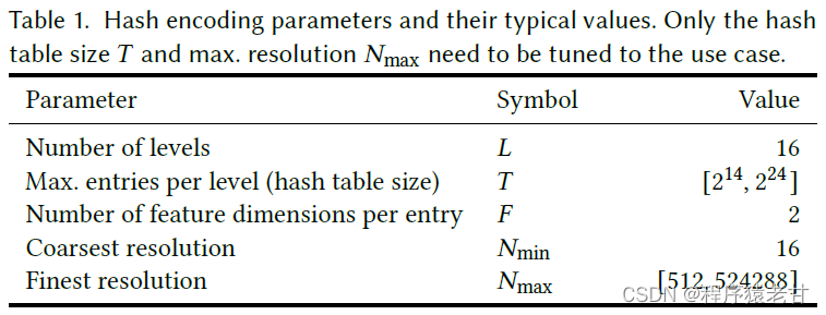 假设提供一个全连接层m(y;Φ), Instant-ngp设计一个针对输入的再赋权:y=enc(x,𝜃)用来提升拟合质量和训练速度,同时避免额外的计算开销。这使得 Instant-ngp不仅拥有可训练的权重值Φ,同时还拥有可训练的编码权重𝜃。这些权重被安排再L层中,每层包含T个特征向量,伴随F维的数据。这些超参数值被表示在下表中: