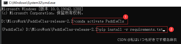 2:使用命令激活环境 conda activate PaddleCls(1所示), 从Github下载PaddleClas, cmd切换到下载路径,输入命令 pip install -r requirments.txt 安装所需依赖(2所示)。如下图所示。
