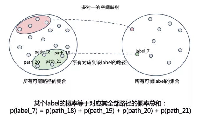 所以,如果要计算𝒑(𝒛│𝒙),可以累加其对应的全部输出序列(也即映射到最终label的“路径”)的概率即可,如下图。