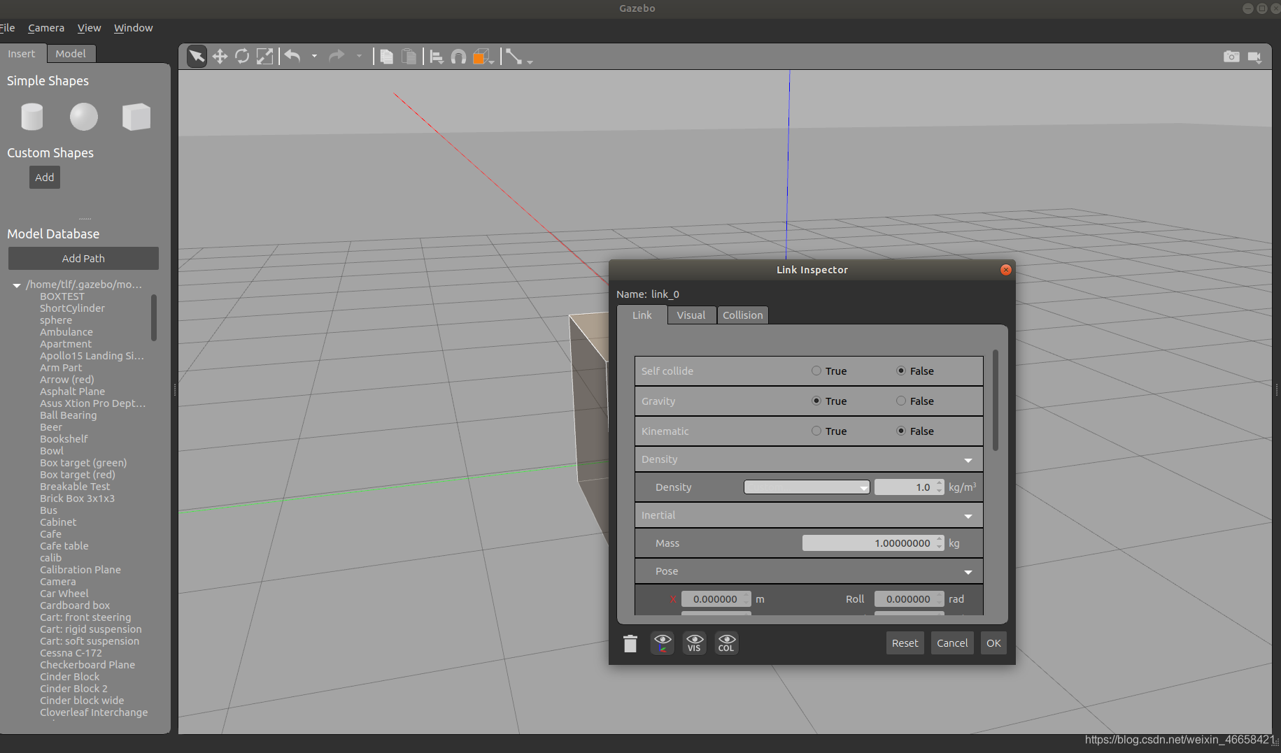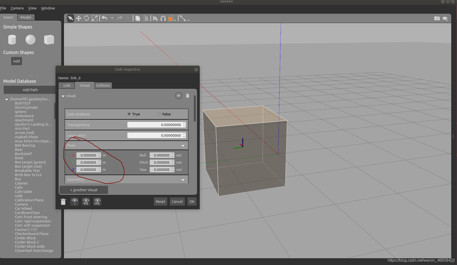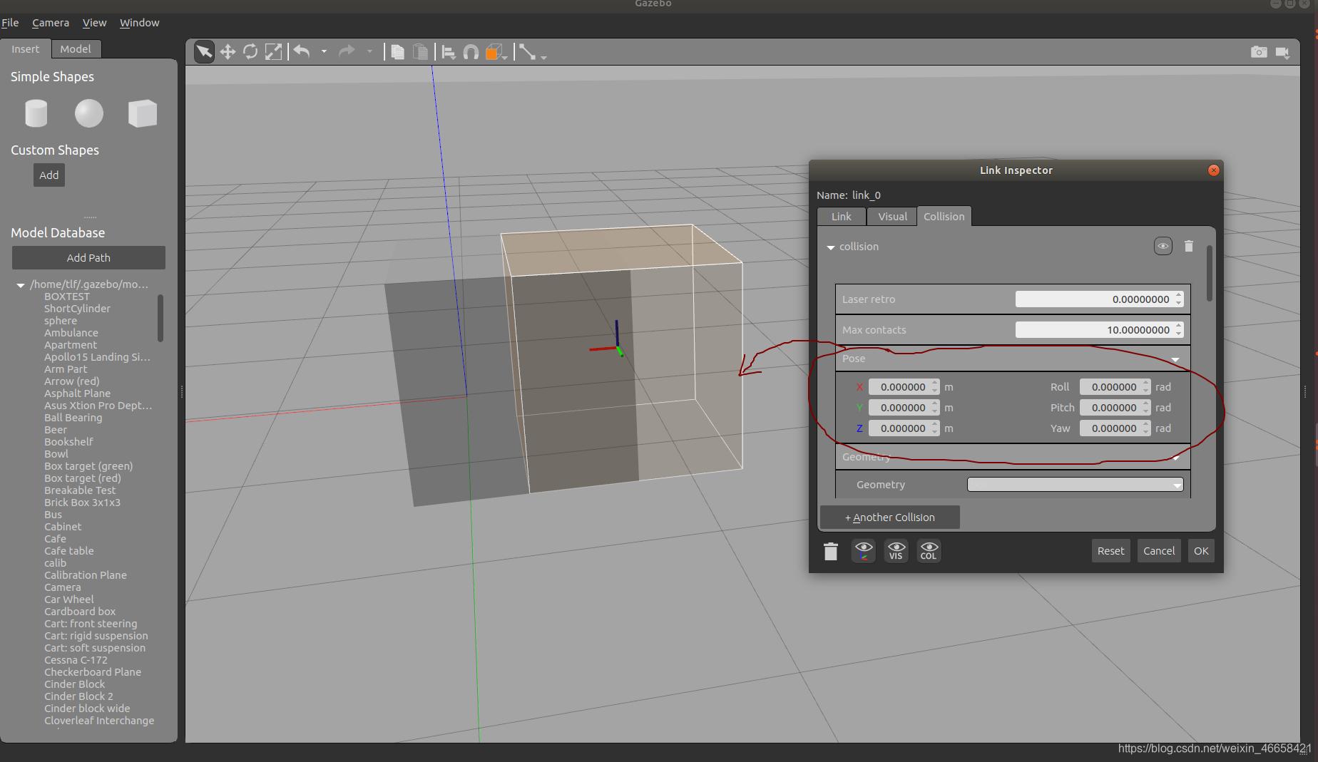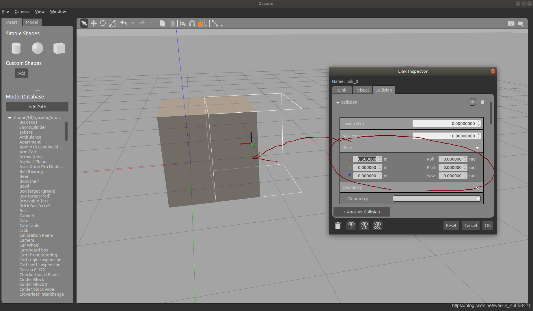 设置Pose的(x,y,z)可以改变橘黄色部分的几何中心的坐标,这个坐标也是基于link坐标系的