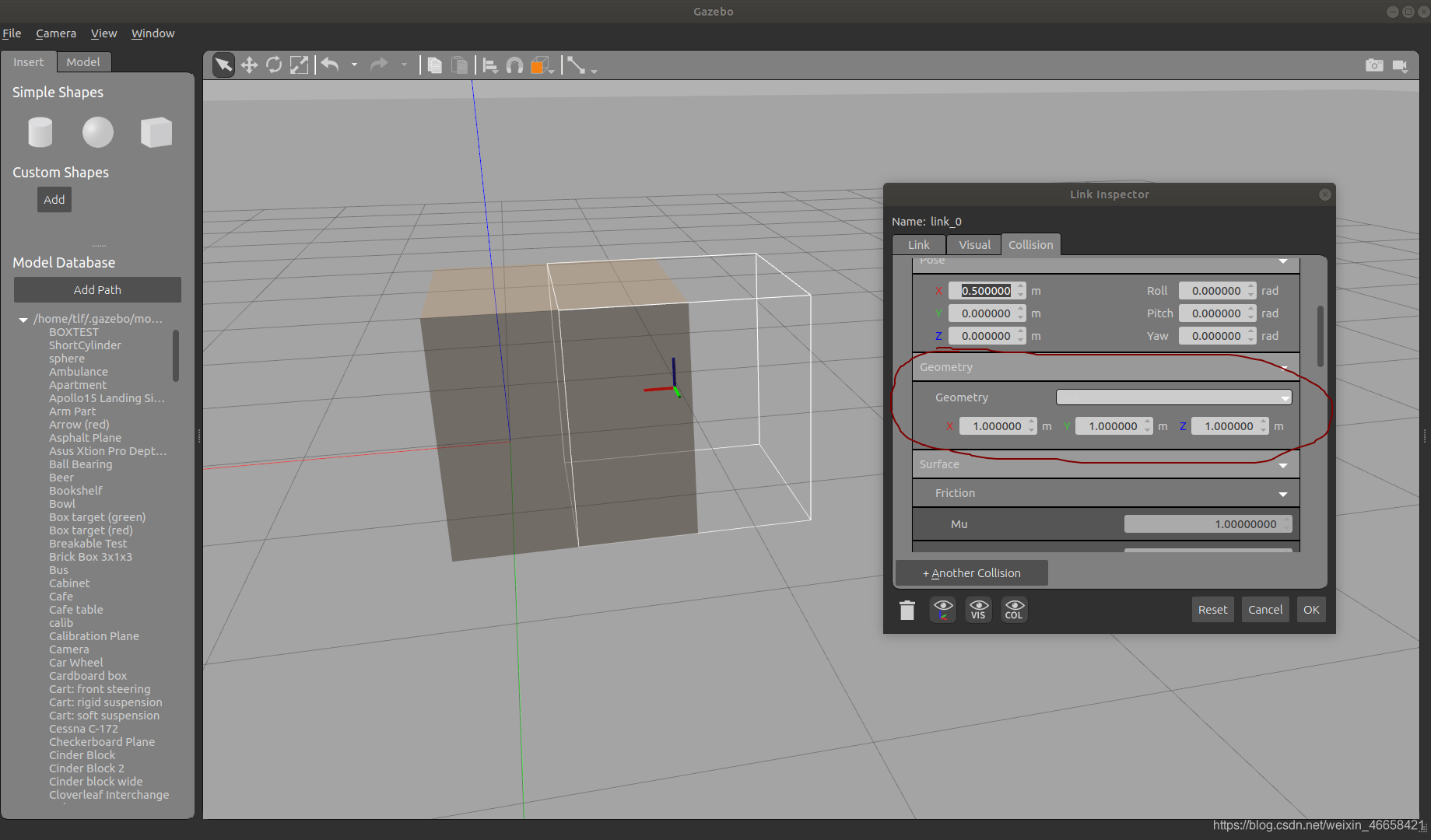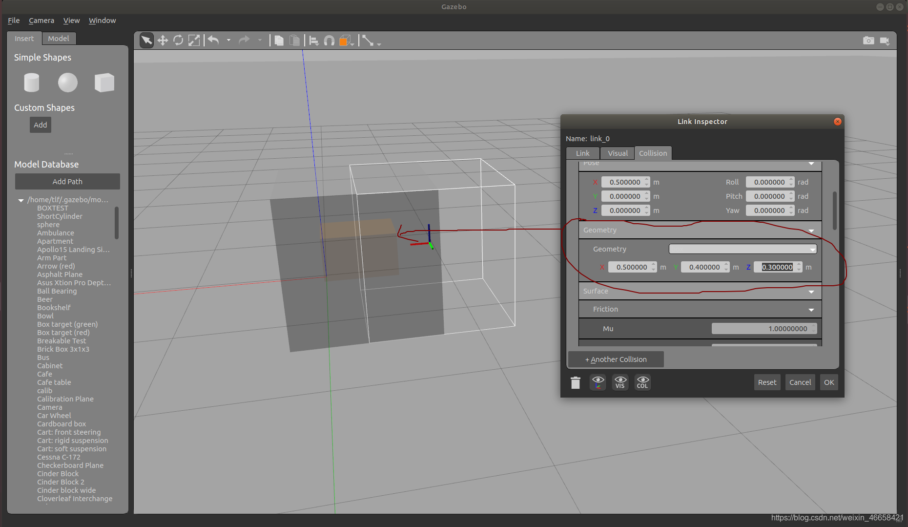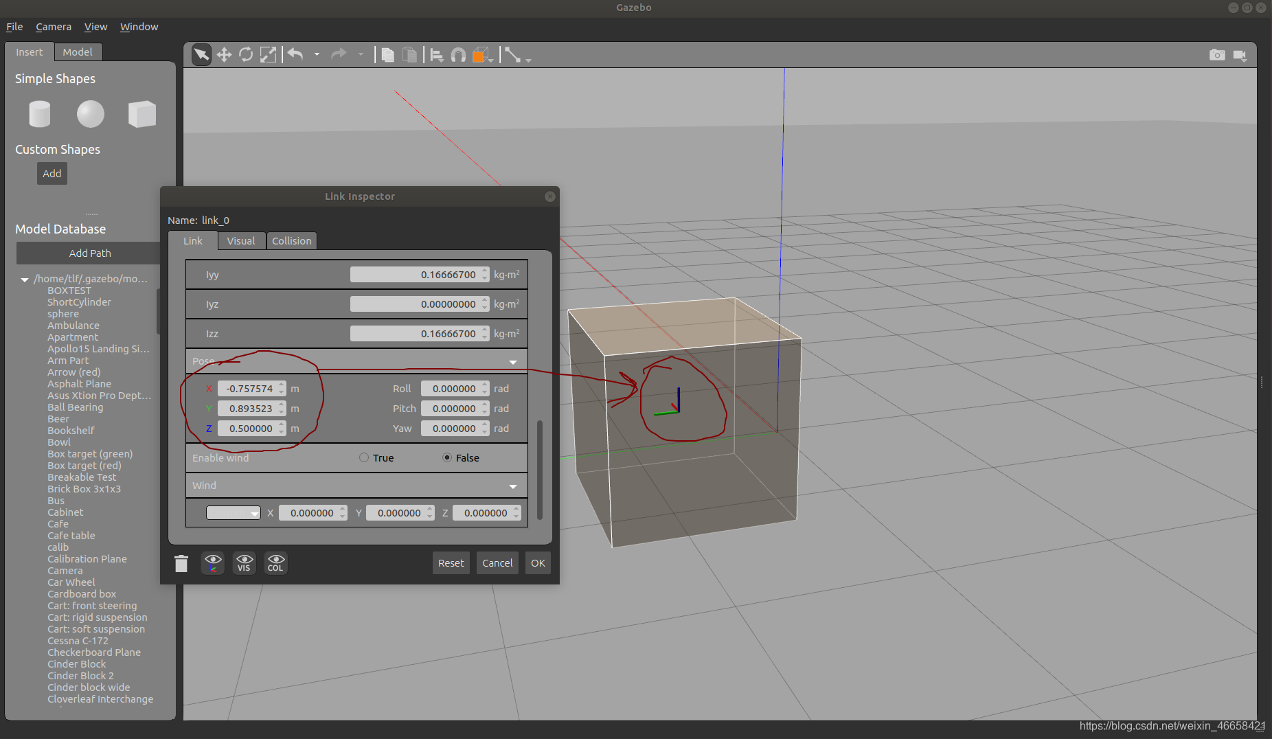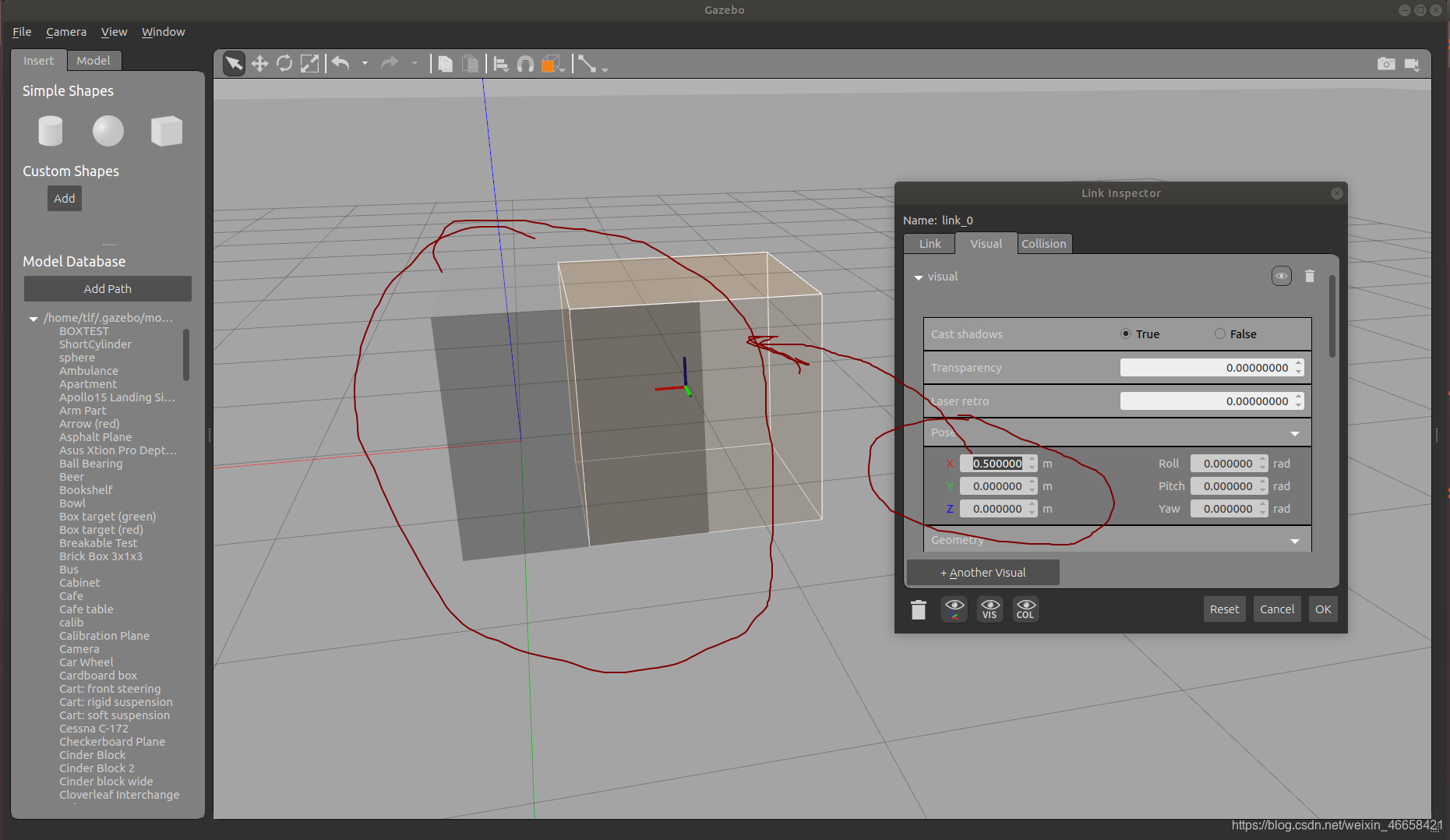 设置Pose的(x,y,z)可以改变橘黄色部分的几何中心的坐标,这个坐标也是基于link坐标系的